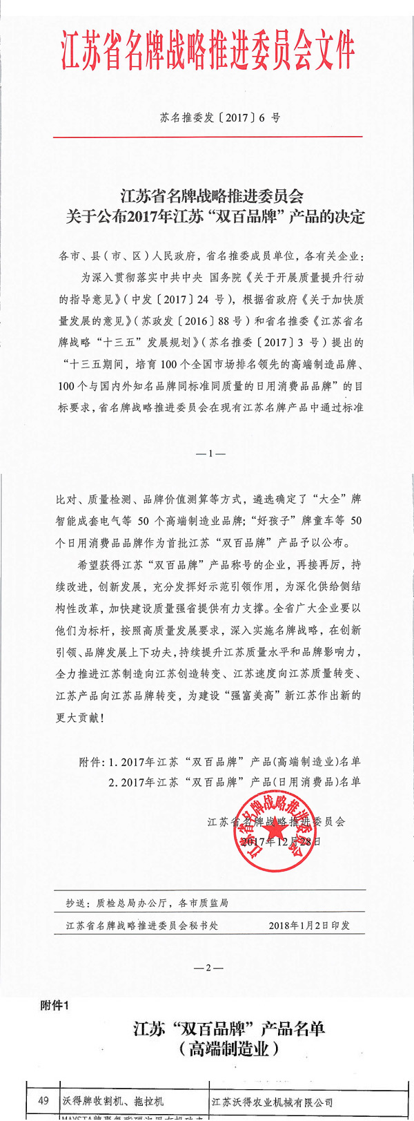 2018年1月2日,江蘇省名牌戰(zhàn)略推進(jìn)委員會(huì)公布了江蘇省“雙百品牌”產(chǎn)品名單,我集團(tuán)下屬子公司江蘇沃得農(nóng)業(yè)機(jī)械有限公司生產(chǎn)的沃得牌收割機(jī)、拖拉機(jī)榮獲江蘇省“雙百品牌”產(chǎn)品稱(chēng)號(hào)。